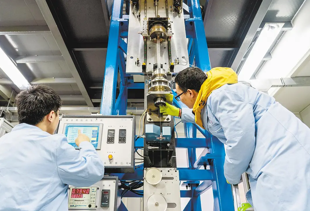 ▲华中科技大学先进功能纤维实验室,实验人员正在进行聚合物光纤拉丝实验。