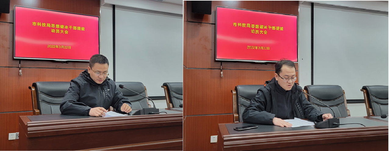 3月22日,市科技局召开思想破冰“四拼四干”干部提能动员大会,局机关、情报所全体干部职工参加会议。局党组书记、局长危爱民出席会议并作动员讲话。