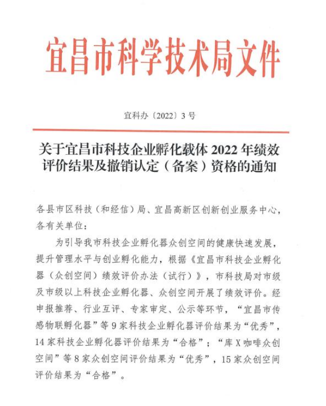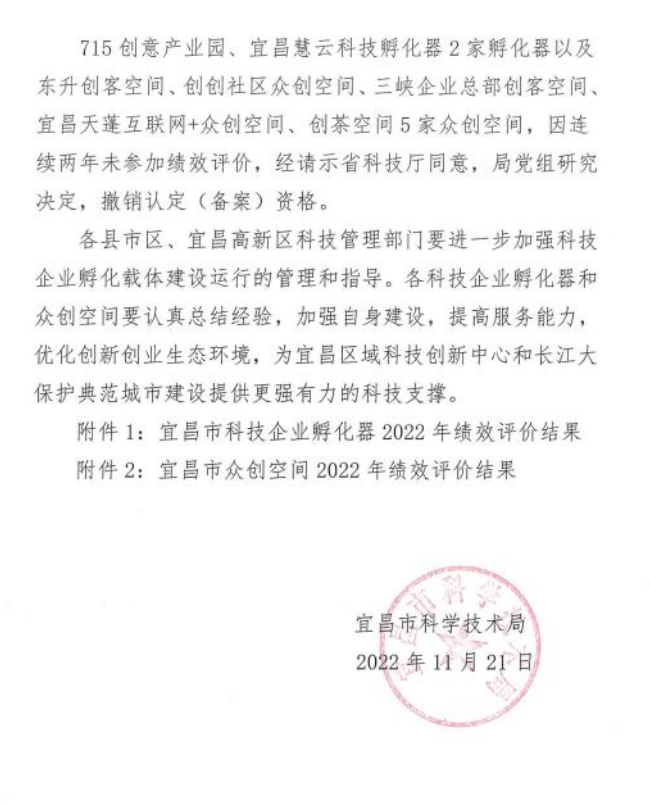 11月21日,宜昌市科技局对全市2022年科技企业孵化载体绩效评价结果进行了通报,9家孵化器和8家众创空间被评为优秀等次,长期运行绩效较差的2家孵化器、5家众创空间被撤销资格。