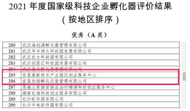 2022年12月28日,科技部火炬中心公布《关于公布国家级科技企业孵化器2021年度评价结果》的通知,我市7家孵化器全部通过了评价,其中,宜昌高新技术产业园区创业服务中心和宜昌欣扬孵化运营管理有限公司2家孵化器获评“优秀”等级(A类),宜昌市西陵区高新技术产业孵化中心等4家获评“良好”等级(B类),优良率达到85.7%。