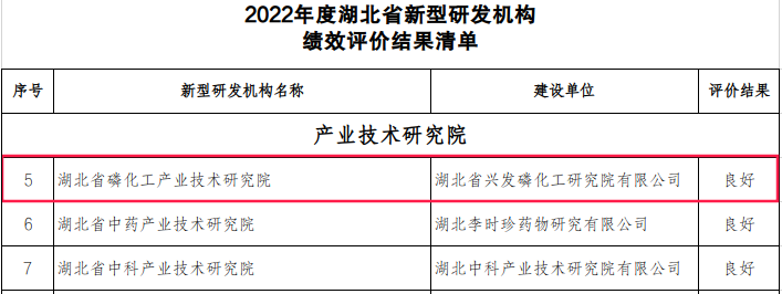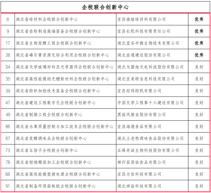湖北省科技厅发布2022年度湖北省新型研发机构绩效评价结果,我市湖北省硅材料企校联合创新中心等4家企校联合创新中心获评“优秀”等级,湖北省光学玻璃材料及光学器件企校联合创新中心等11家获评“良好”等级;湖北省磷化工产业技术研究院1家省级产业技术研究院获评“良好”等级。