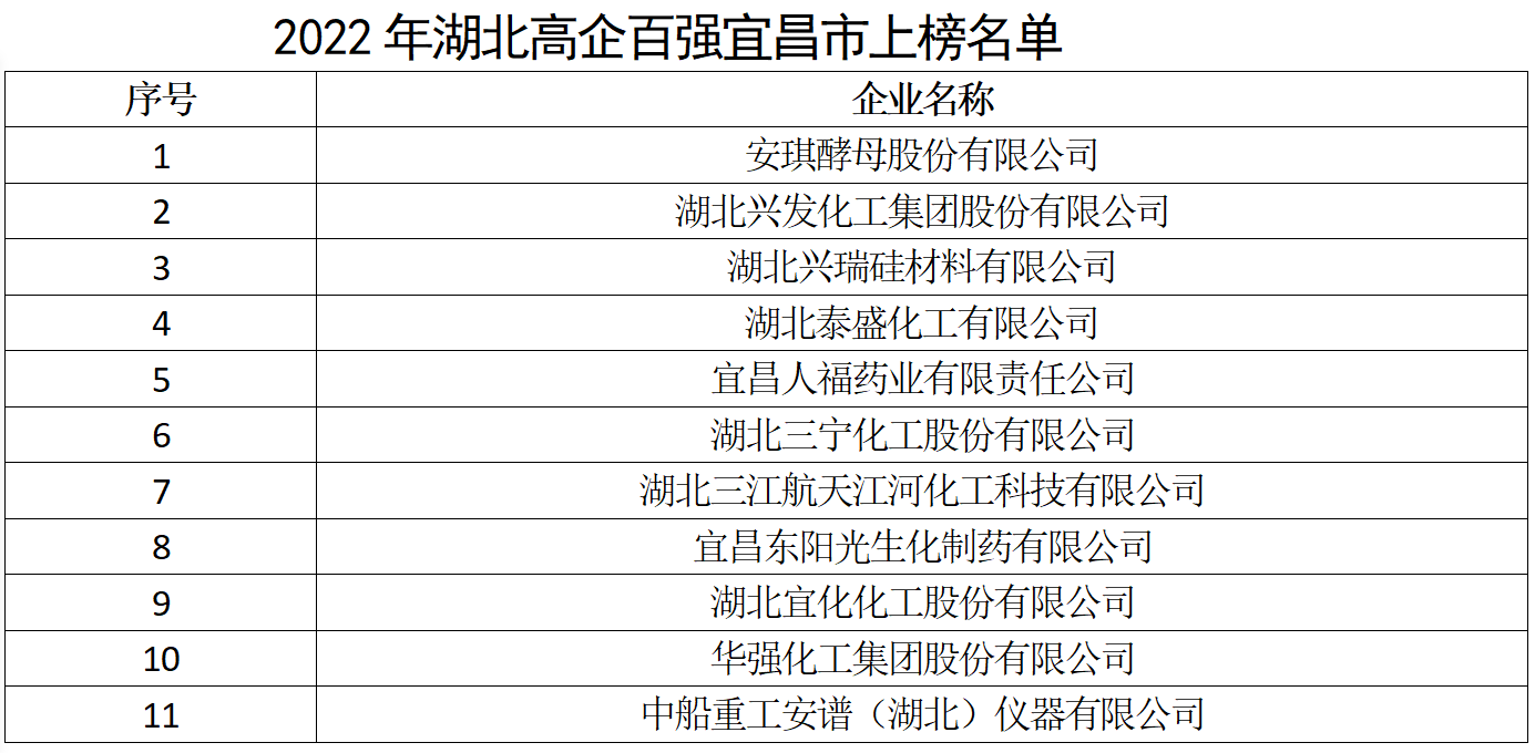 2月15日,湖北省科技厅发布2022年百强高新技术企业榜单,宜昌11家企业上榜,上榜数量仅次武汉市。