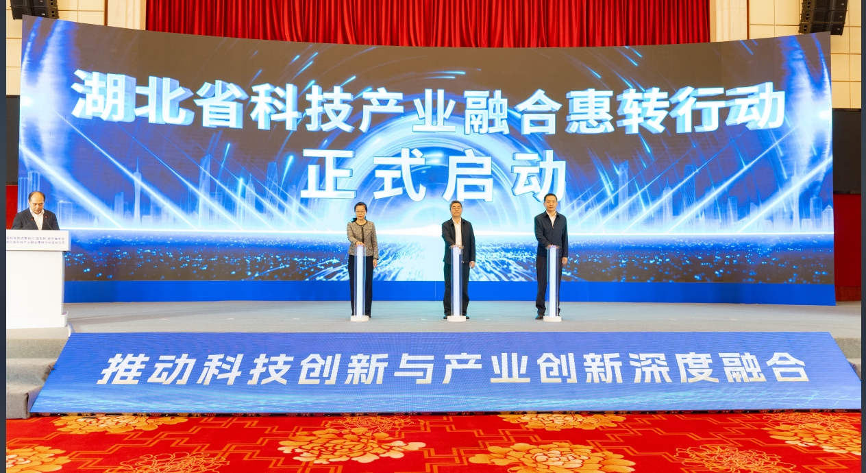 活动现场,李海波、吴勇杰、徐伟营共同按下启动键,标志着湖北省科技产业“融合惠转”行动正式运行。