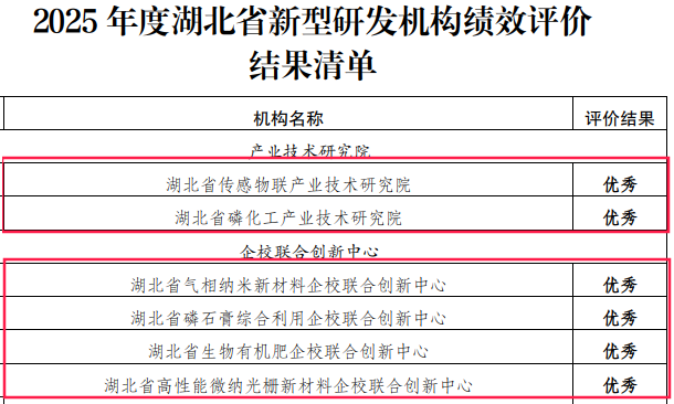 近日,湖北省科技厅公布2025年度湖北省新型研发机构绩效评价结果,我市6家单位表现突出,获评“优秀”等级。其中,湖北省传感物联产业技术研究院、湖北省磷化工产业技术研究院2家产业技术研究院,以及湖北省气相纳米新材料企校联合创新中心等4家企校联合创新中心榜上有名。